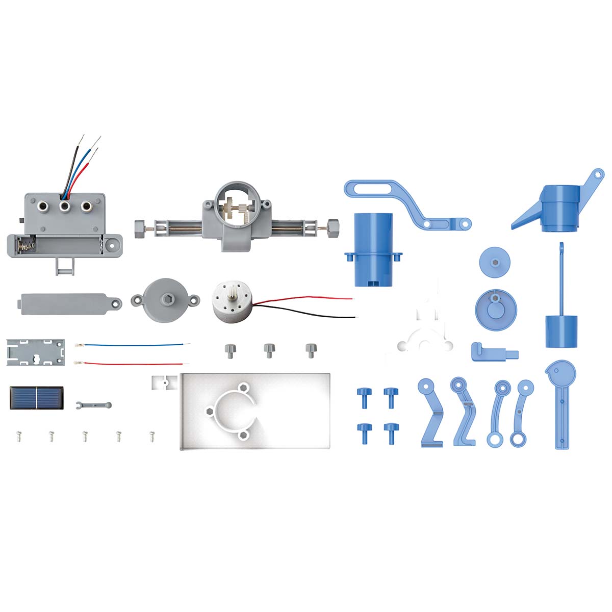 ✅ Skrzynia biegów, moduł akumulatora, głowica cylindra, złącze tłoka, podstawa pompy, rama główna, zawias panelu słonecznego, tłok, podstawa cylindra, środkowy cylinder, złącze lufy, kołki, małe i duże koło zębate, ramiona i nogi figurki, złącze i obudowa figurki, głowica figury, podstawa panelu słonecznego, panel słoneczny, pokrywa baterii, pokrywa silnika, twarz figury, silnik, przewody panelu słonecznego, osłony zacisków, małe śruby, instrukcja.